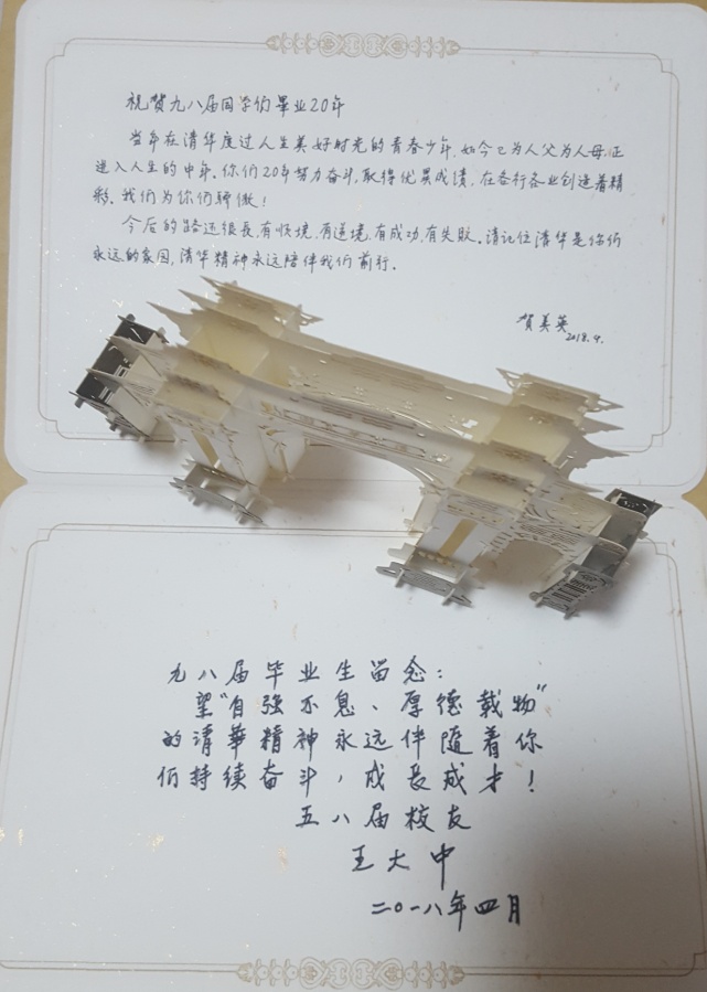 在我们1998届毕业二十周年之际,我得到了两份珍贵的题词,是今年83岁的原校长王大中院士和今年81岁的原校党委书记贺美英老师写给我们的。王大中老师题词言简意赅,犹如严父:“九八届毕业生留念:望‘自强不息、厚德载物’的清华精神永远伴随着你们持续奋斗,成长成才!”贺美英老师题词细致温暖,宛如慈母:“祝贺九三级同学们毕业20年!当年在清华度过人生美好时光的青春少年,如今已为人父为人母,正进入人生的中年。你们20年努力奋斗,取得优异成绩,在各行各业创造着精彩。我们为你们骄傲!今后的路还很长,有顺境,有逆境,有成功,有失败。请记住清华是你们永远的家园,清华精神永远陪伴我们前行。”