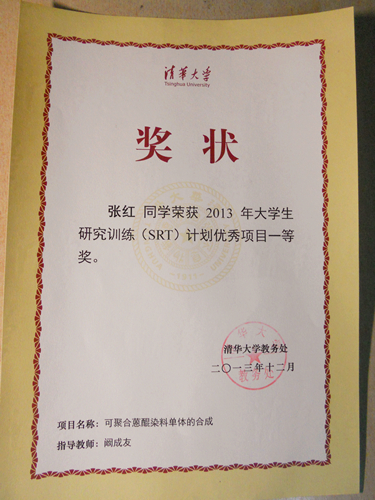 2013年12月,祝贺本科生张红从全校1000余项SRT项目中脱颖而出,获得清华大学SRT计划成果一等奖(全校1等奖共15人)