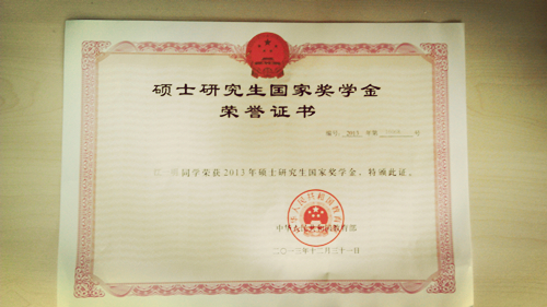 2013年10月,祝贺硕士生江一明获得国家奖学金