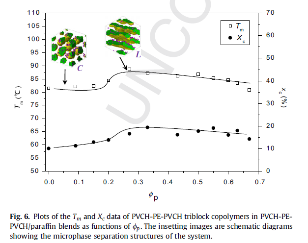 另一方面,本课题组利用聚乙烯基环己烷-b-聚乙烯-b-聚乙烯基环己烷(PVCH-b-PE-b- PVCH)三嵌段共聚物与PE均聚物或低分子量石蜡进行共混,发现受限在微相分离空间中的PE,其熔点与本体PE的熔点十分接近,而远高于嵌段共聚物中的PE嵌段熔点,从而澄清了在三嵌段共聚物中,玻璃态PVCH段的束缚效应对受限结晶起到主要贡献。最近本课题组还在进一步开展多臂星型聚乳酸的受限结晶研究。